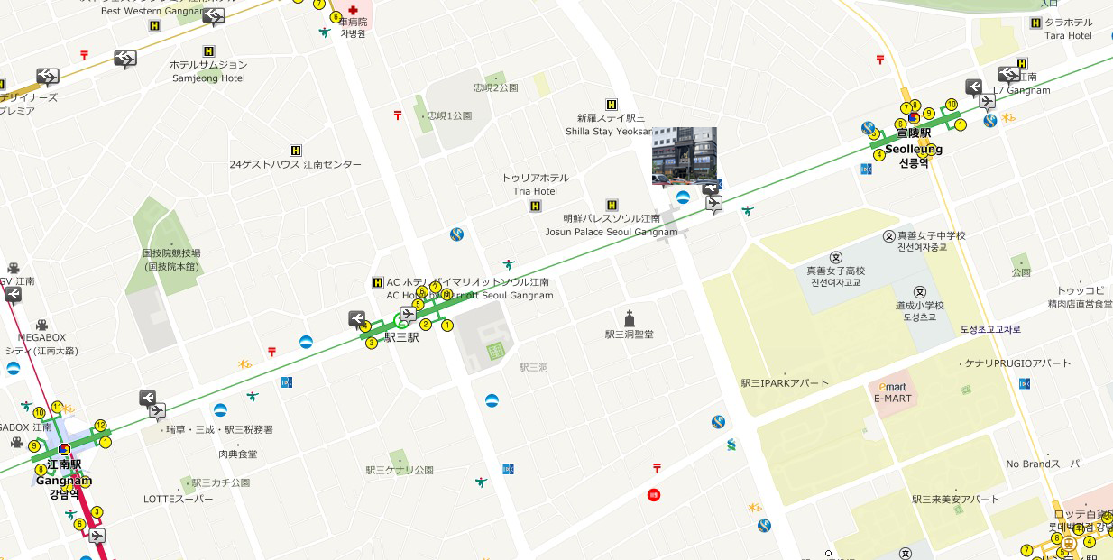 このホテルの最寄り駅は江南(カンナム)駅、宣陵(ソンルン)駅の間にある『駅三』(ヨクサム)駅になるんだけど、徒歩かバス利用で縦横無尽に動ける。