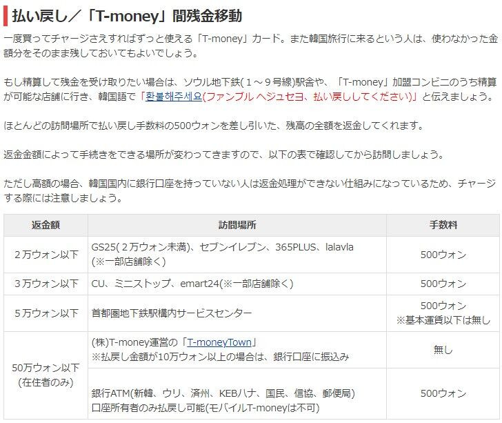 あと、すでにT-moneyを持っている人はそのまま使ってもいいし、コンビニで現金化できるんだけど、俺が行ったコンビニ「GS25」では残高が20000ウォン(2000円)以下にならないと払い戻しが出来ないと言われたので参考までに。