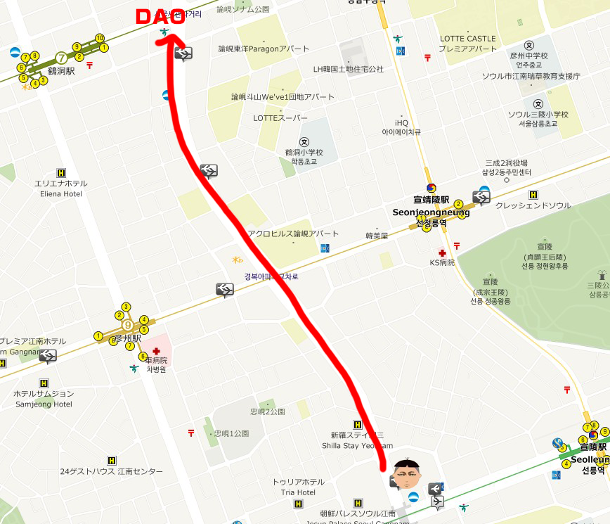 ちなみに俺の泊まっていたホテルは、前回レポのキャッスルはホテルから徒歩で行けて、今回のDAOはバスで10分と掛からない。江南駅もホテル最寄りのバス停から一本で行けるし、このホテルはマジで按摩へ行くにはもってこいのホテル。